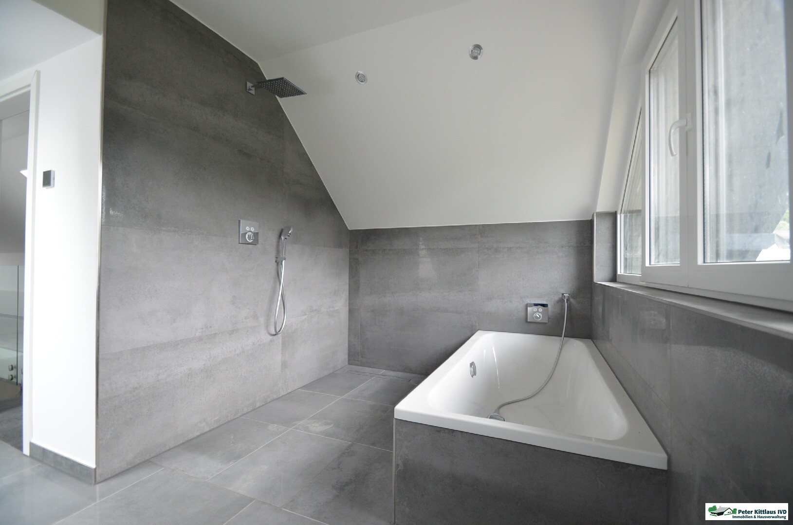 Eine elegante Treppe mit Glaselementen führt Sie in das Dachgeschoss. Hier finden Sie ein großzügiges Badezimmer mit Regendusche und einer eleganten Badewanne für entspannte Momente. Gegenüber ist ein geräumiges Studio, das sich über die gesamte Breite des Dachgeschosses erstreckt. Dank großer Fenster und dezenter Deckenbeleuchtung ist dies der ideale Ort für ein prächtiges Schlafzimmer oder einen exquisiten Rückzugsbereich.
