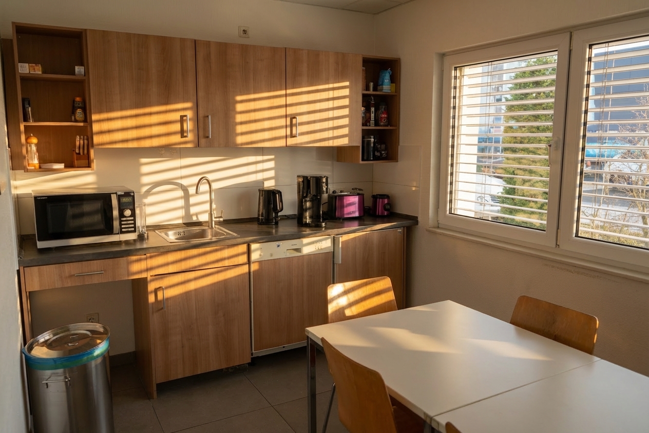 Der Innenbereich ist mit einem widerstandsfähigen Mix aus Beton- und Fliesenboden ausgestattet. Diese Kombination sorgt für eine besonders robuste und pflegeleichte Oberfläche, die auch für eine intensive gewerbliche Nutzung bestens geeignet ist.